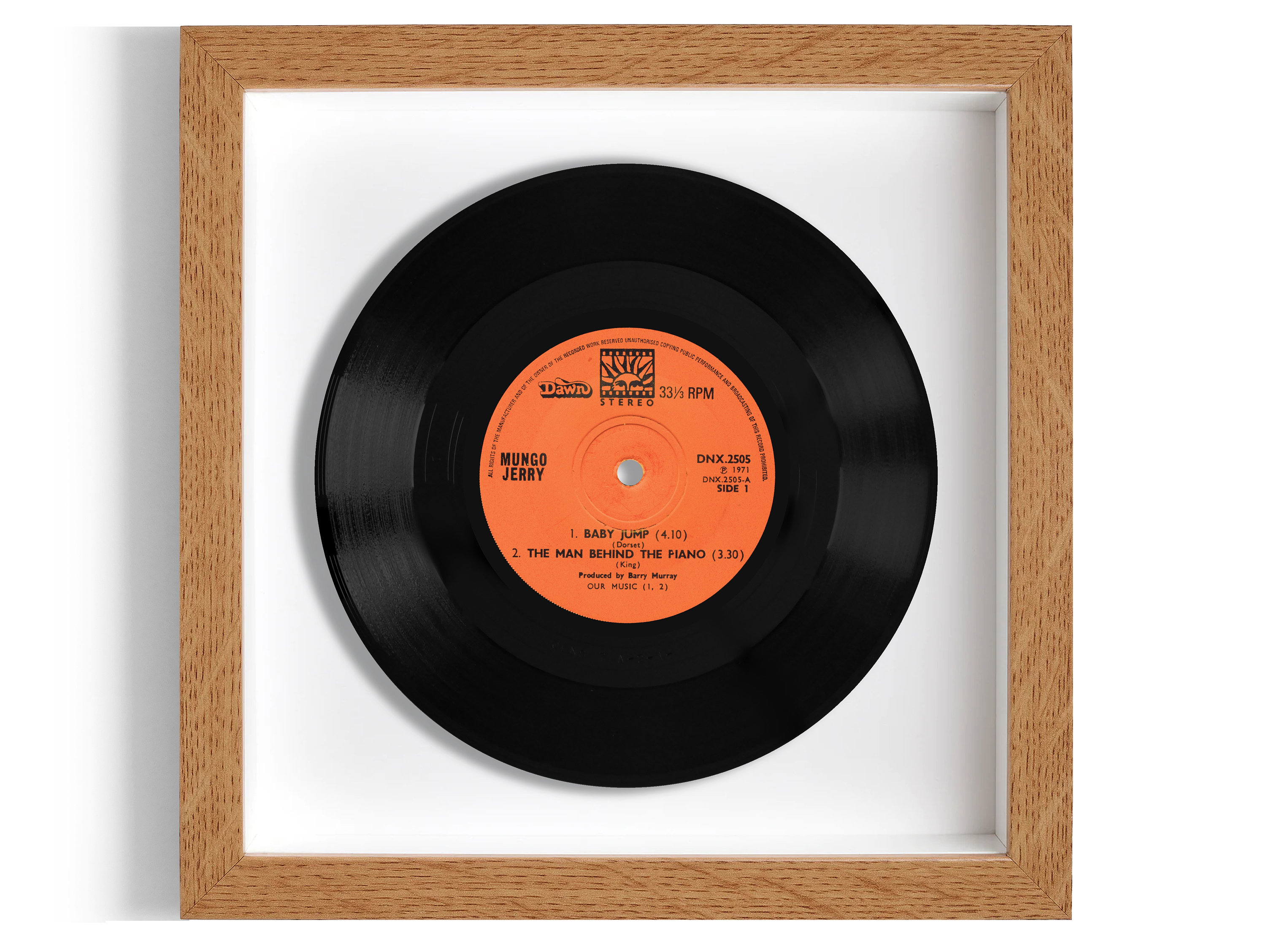 This is the genuine 7” record, raised within the frame, giving a fantastic 3D 'floating' effect. This is surrounded by either plain white cartridge paper or vintage sheet music and a black, white or oak-effect frame, with a clear plastic glass front.