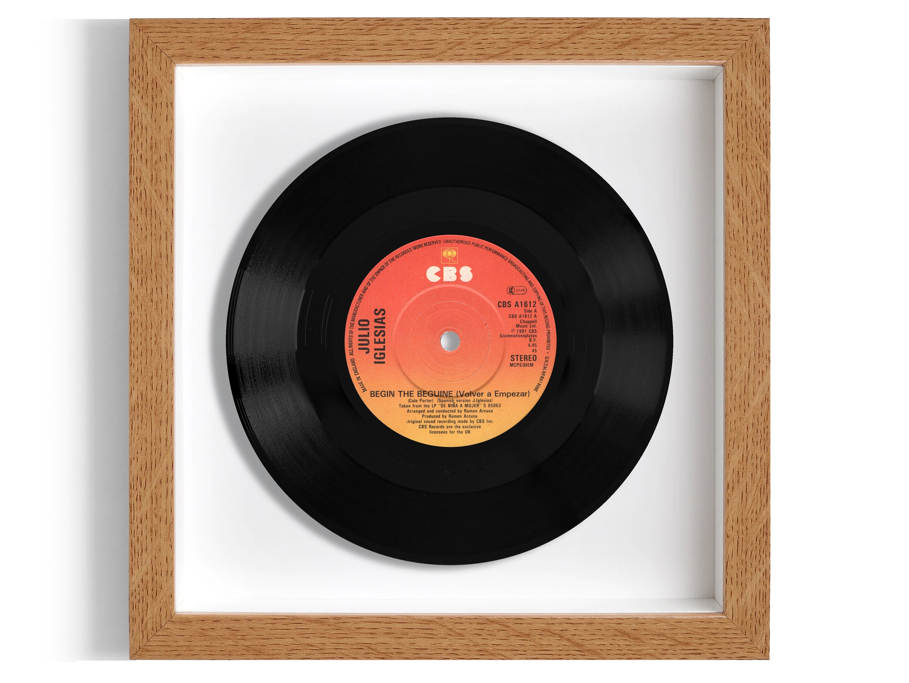 This is the genuine 7” record, raised within the frame, giving a fantastic 3D 'floating' effect. This is surrounded by either plain white cartridge paper or sheet music and a black, white or oak-effect frame, with a clear plastic glass front.