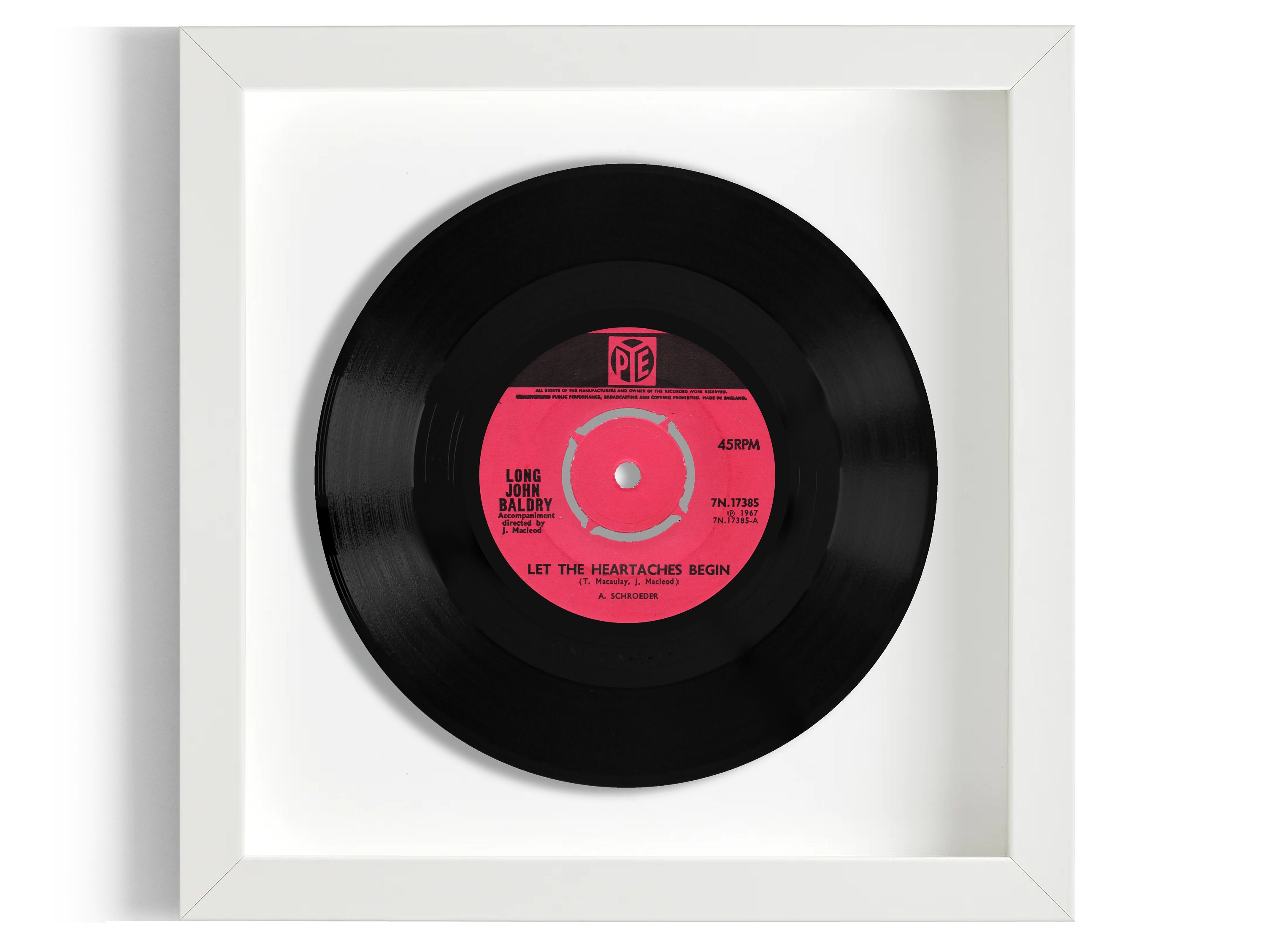 This is the genuine 7” record, raised within the frame, giving a fantastic 3D 'floating' effect. This is surrounded by either plain white cartridge paper or vintage sheet music and a black, white or oak-effect frame, with a clear plastic glass front.