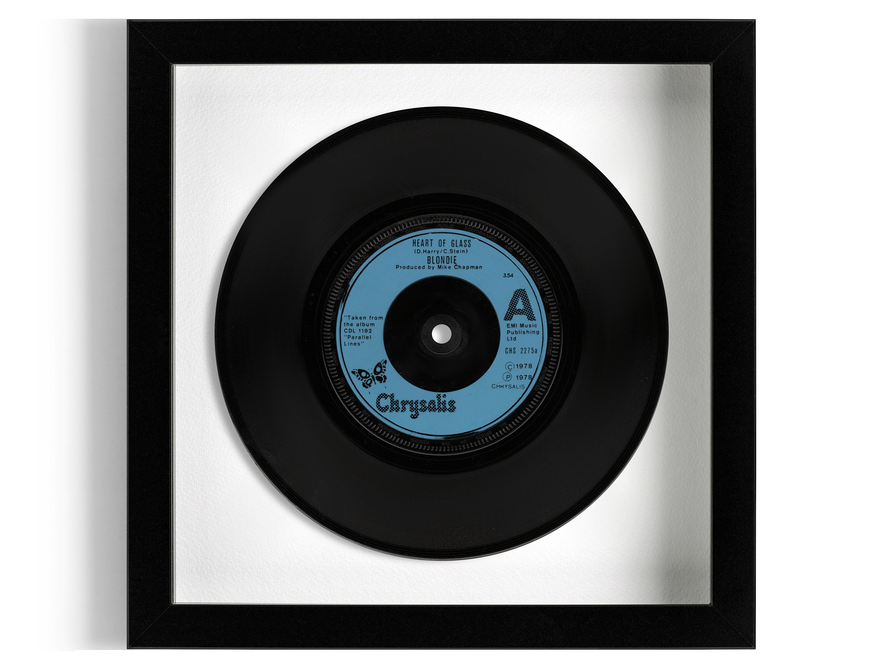 This is the genuine 7" record, raised within the frame, giving a fantastic 3D 'floating' effect. This is surrounded by either plain white cartridge paper or sheet music and a black, white or oak-effect frame, with a clear plastic glass front.